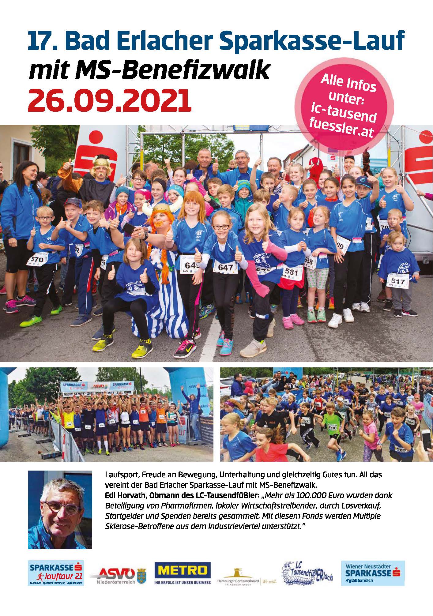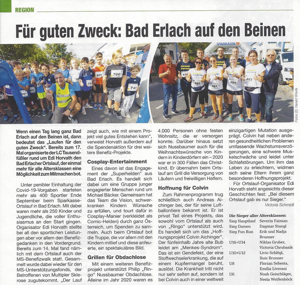 Wenn einen Tag lang ganz Bad Erlach auf den Beinen ist, dann bedeutet das „Laufen für den guten Zweck". Bereits zum 17. Mal organisierte der LC Tausendfüßler rund um Edi Horvath den Bad Erlacher Ortslauf, der einmal mehr für alle Altersklassen eine Möglichkeit zum Mitmachen bot.